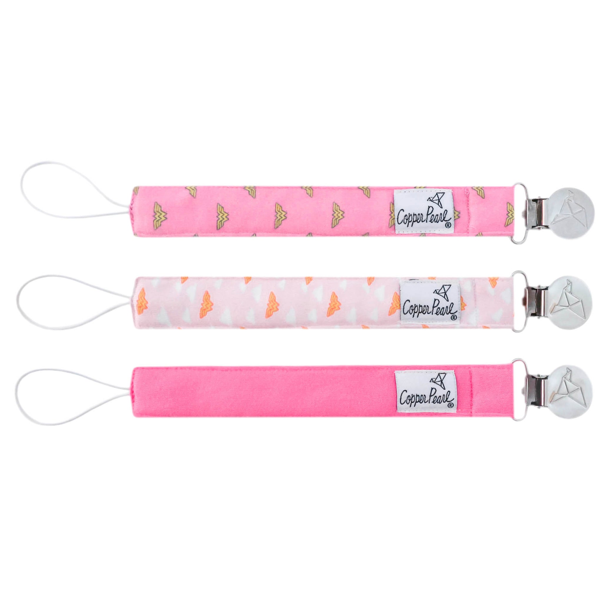 A chic way to keep baby's pacifier close at hand. Premium knit fabric strap. Stainless steel clip. Sold in Set of 3.