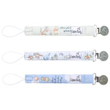 A chic way to keep baby's pacifier close at hand. Premium knit fabric strap. Stainless steel clip. Sold in Set of 3.