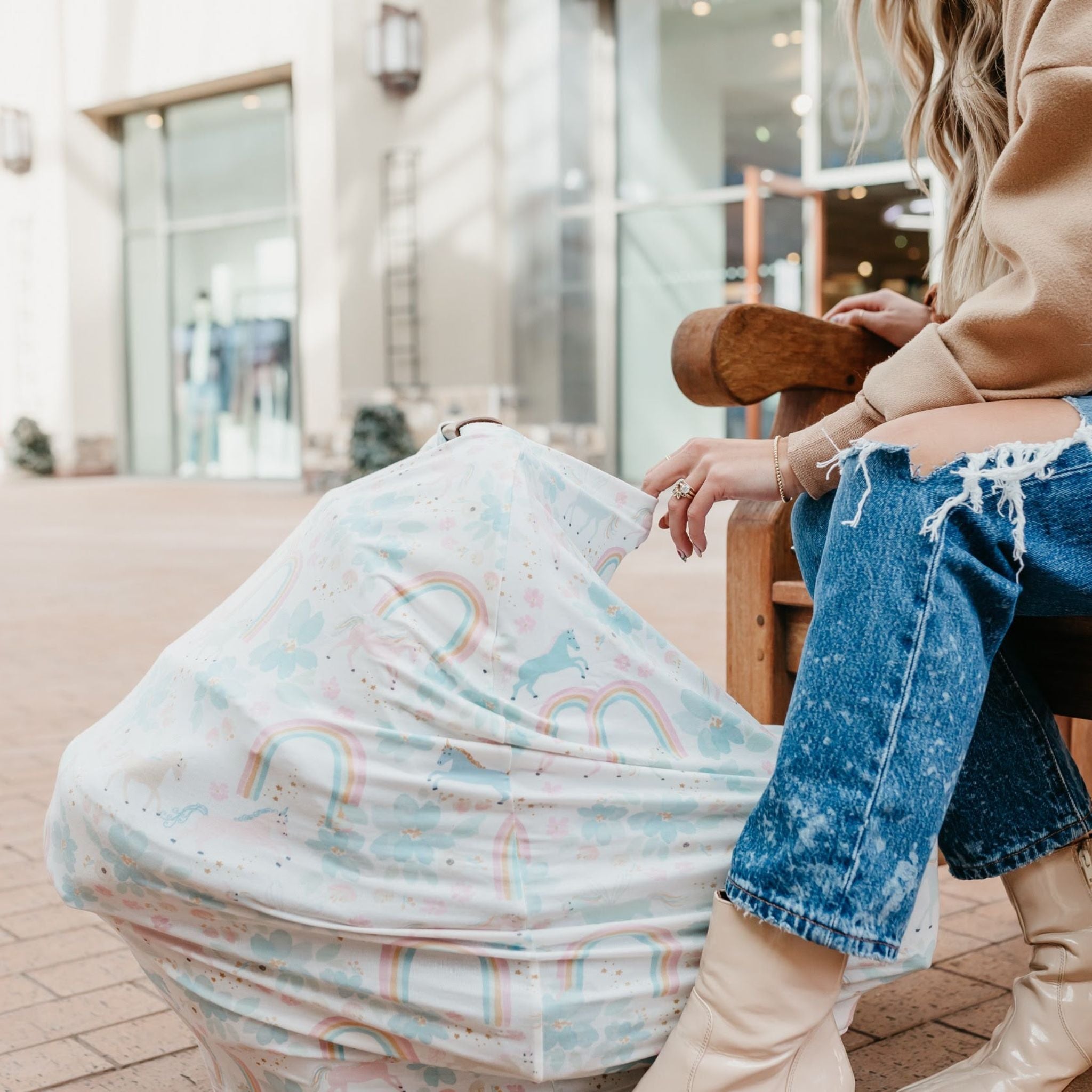 • Stretchy fabric fits most all car seats, shopping carts, high chairs and nursing mothers. It can also be a trendy infinity scarf!