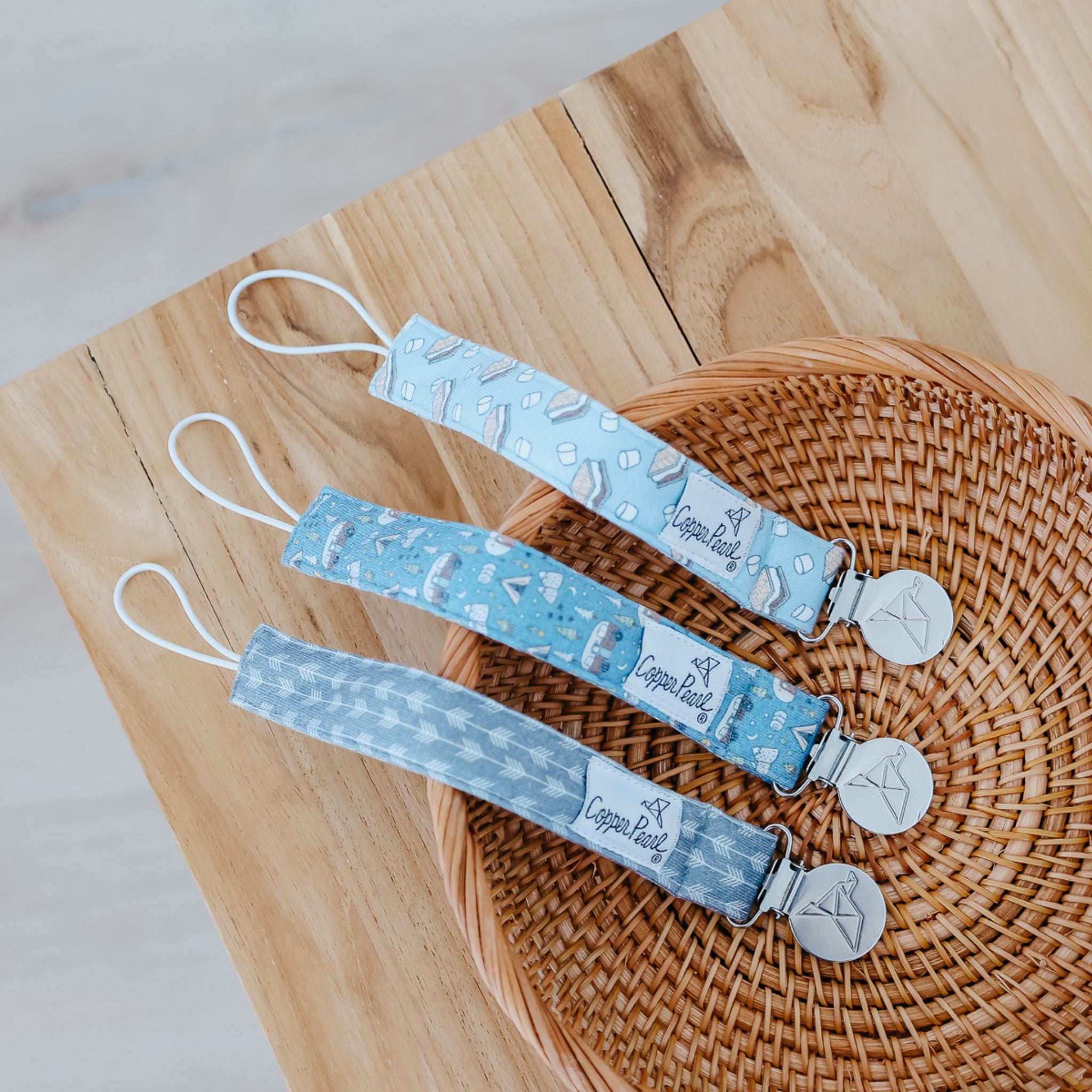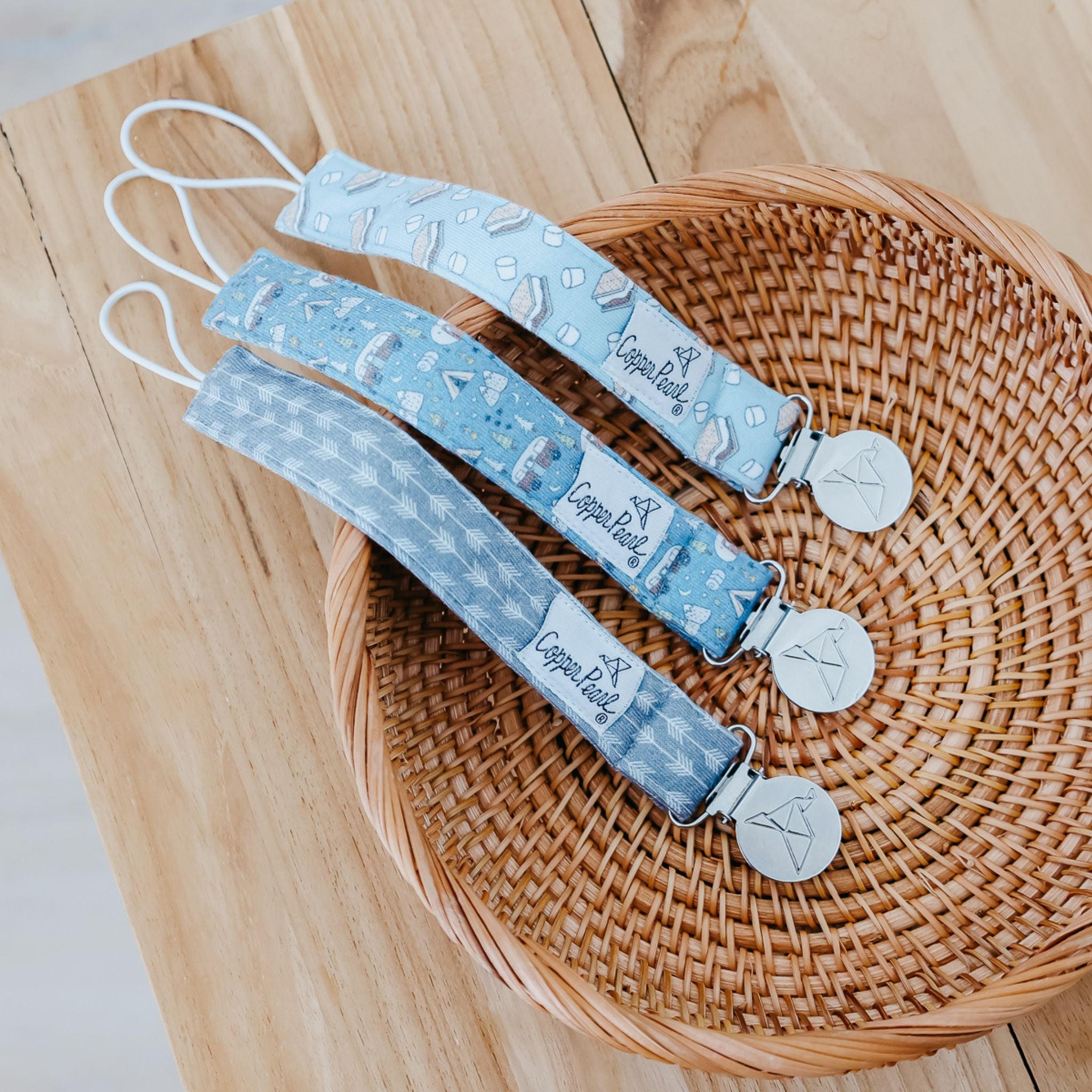 A chic way to keep baby's pacifier close at hand. Premium knit fabric strap. Stainless steel clip. Sold in Set of 3.