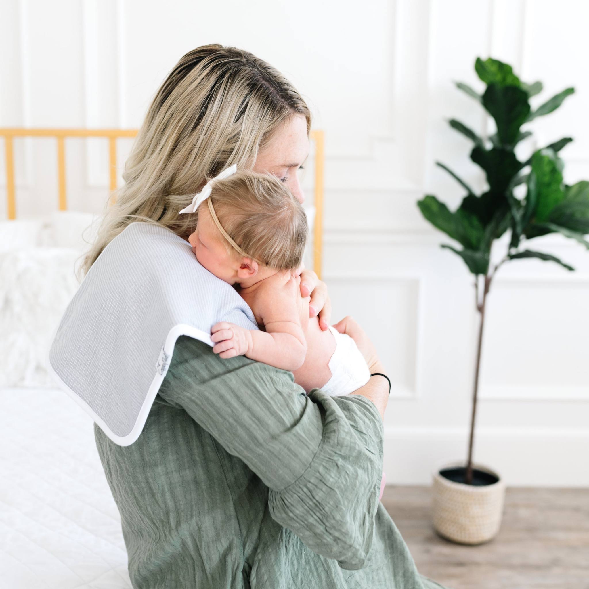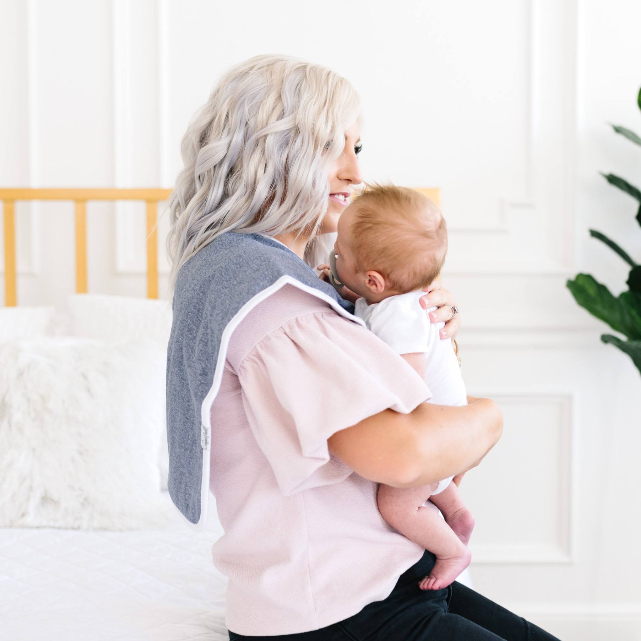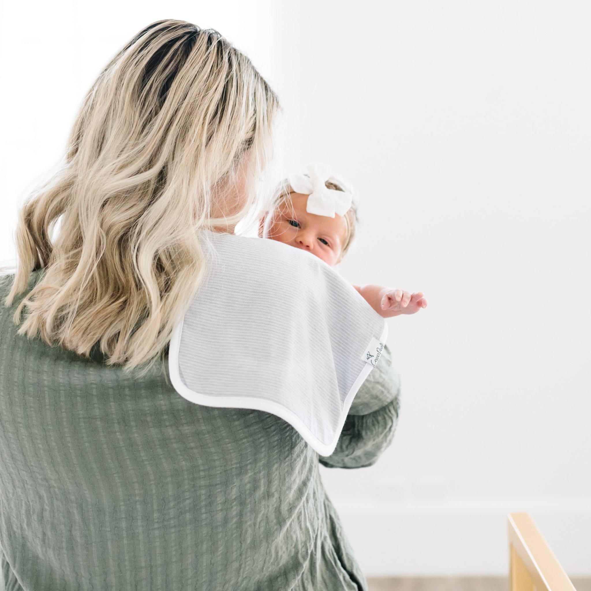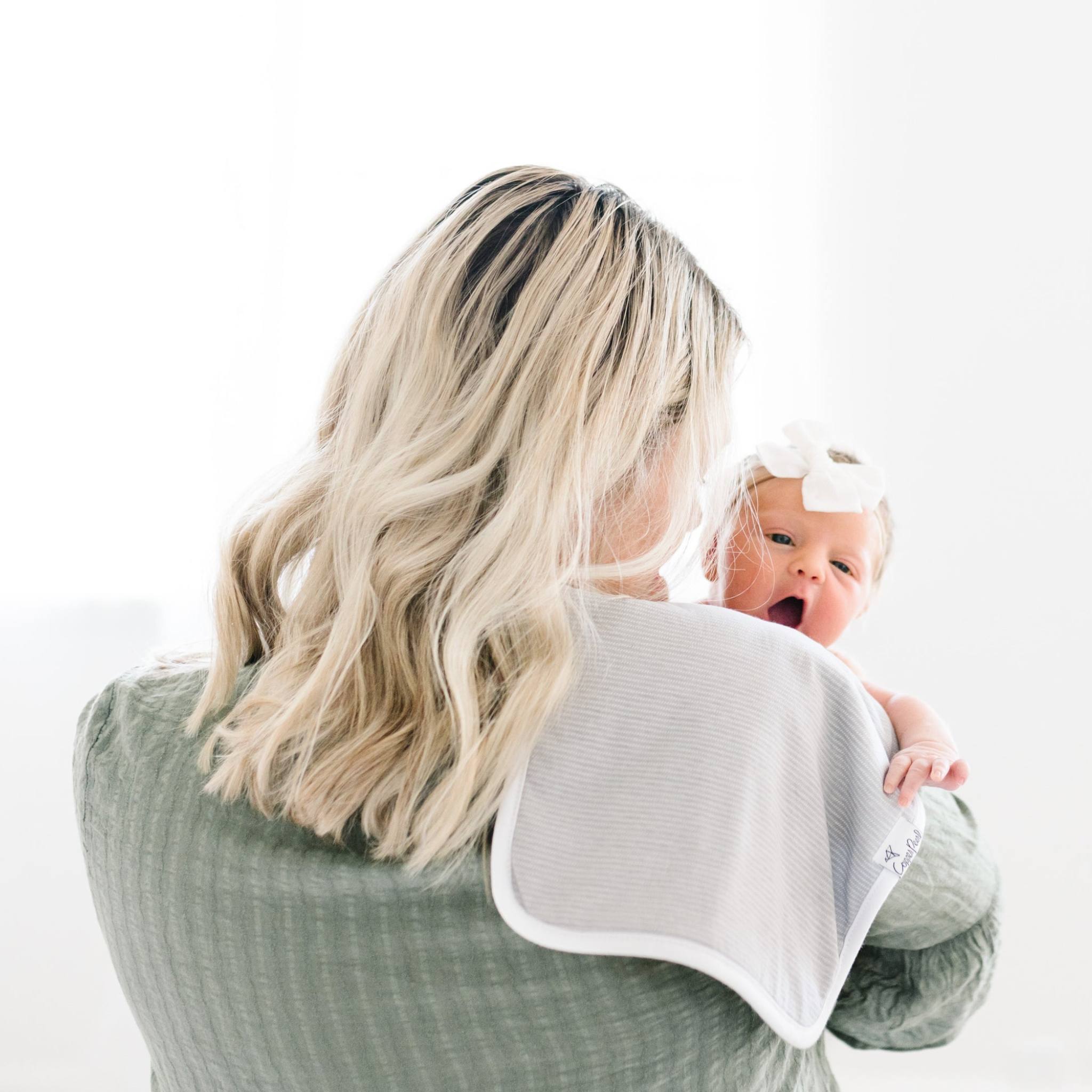 Our burp cloths come in a generous 21x10 inch size, providing greater shoulder coverage (and less outfit changes) for Mom and Dad.